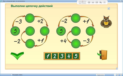 На уроке математике в 1 классе при изучении темы: «Состав числа 9» в устном счете я использовала готовые тренажеры КМ-школы для повторения состава однозначных чисел. В условиях большой наполняемости класса это задание очень удобно использовать, так как есть у каждого ребенка выйти к доске.